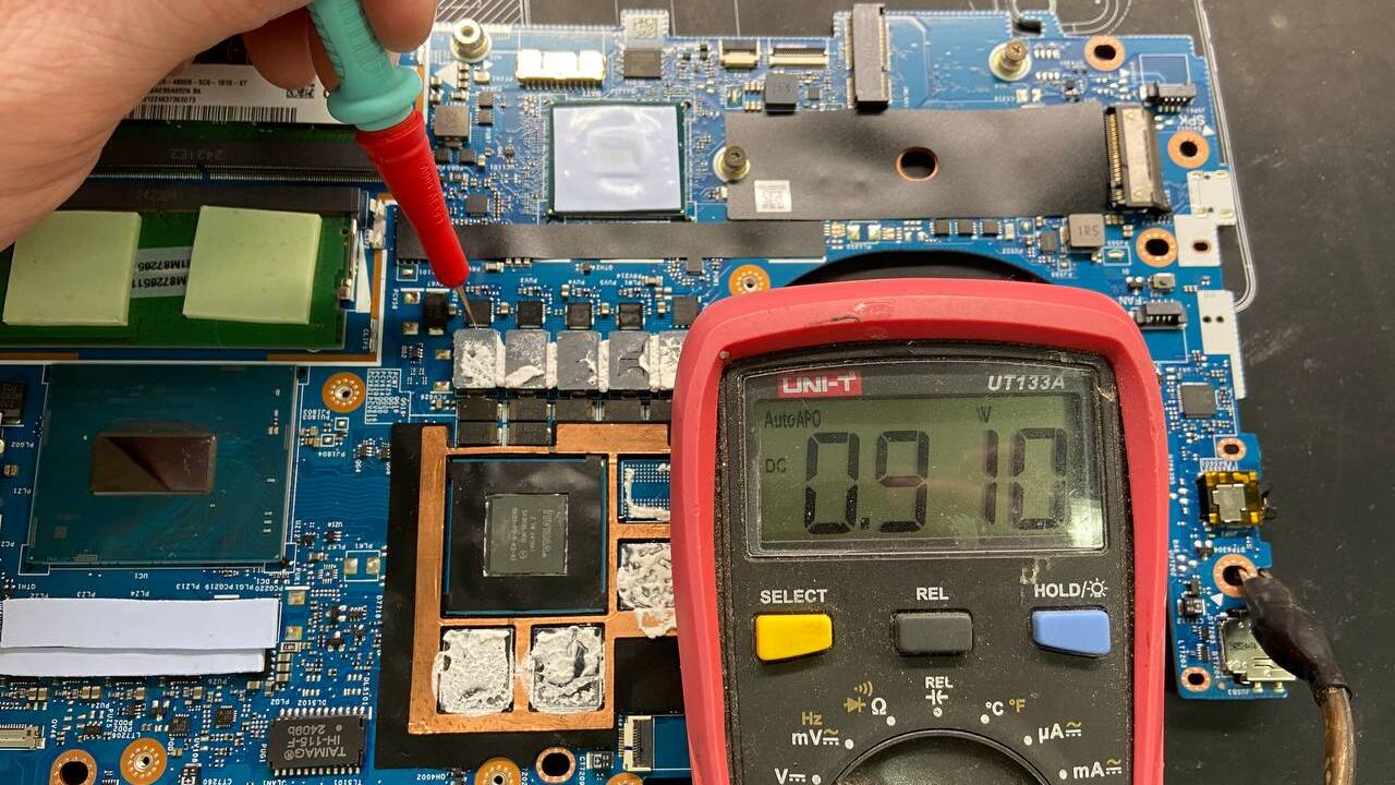 Процесс делится на первичный осмотр,програмнную и аппаратную проверку. Если устройство включается, инженеры тестируют температурные режимы под нагрузкой и проверяют состояние накопителей. Если ноутбук не стартует, требуется аппаратная диагностика с разборкой корпуса. Мастер проверяет материнскую плату, замеряет напряжения в контрольных точках и сопротивление основных чипов. Это позволяет выявить короткие замыкания, пробитые конденсаторы или сгоревшие микросхемы.