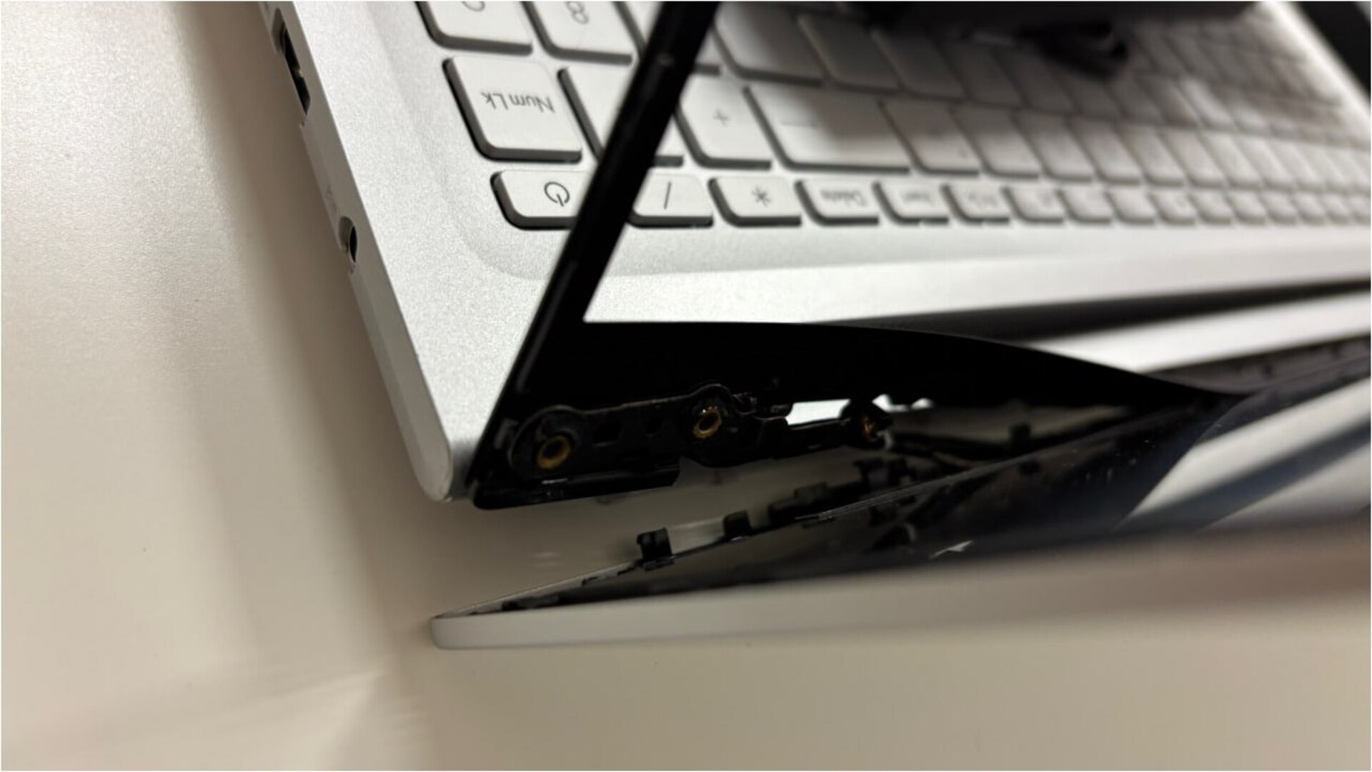 Первый признак неисправности — изменение жесткости хода крышки: она открывается слишком туго, двумя руками, или наоборот не фиксируется и падает. Характерным симптомом также является слышимый хруст или щелчки при движении крыщки матрицы ноутбука. Если проблему игнорировать, тугая петля начинает выламывать места своего крепления. Визуально это проявляется как расхождение корпусных панелей в углах ноутбука при открытии, появление трещин на топкейсе или рамке крышки матрицы. В запущенных случаях перекос крышки может привести к повреждению шлейфа матрицы: пропадает изображение в определенном положении или повреждению самой матрицы ноутбука.